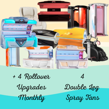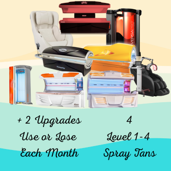 Begin your glow routine: enjoy one skin care red light bed each visit. Tan every other day and enjoy our 1st 2 levels of hybrid tanning upgraded into your package. Get four Level 1-4 PLUS Double Legs spray tans each month which include Perfector Prep and Hydrate Finish. Save $ on upgrade packages. Want something not in your package, take 50 percent off any additional service. Get 4 Free Upgrades a month with this package, they roll over if unused.